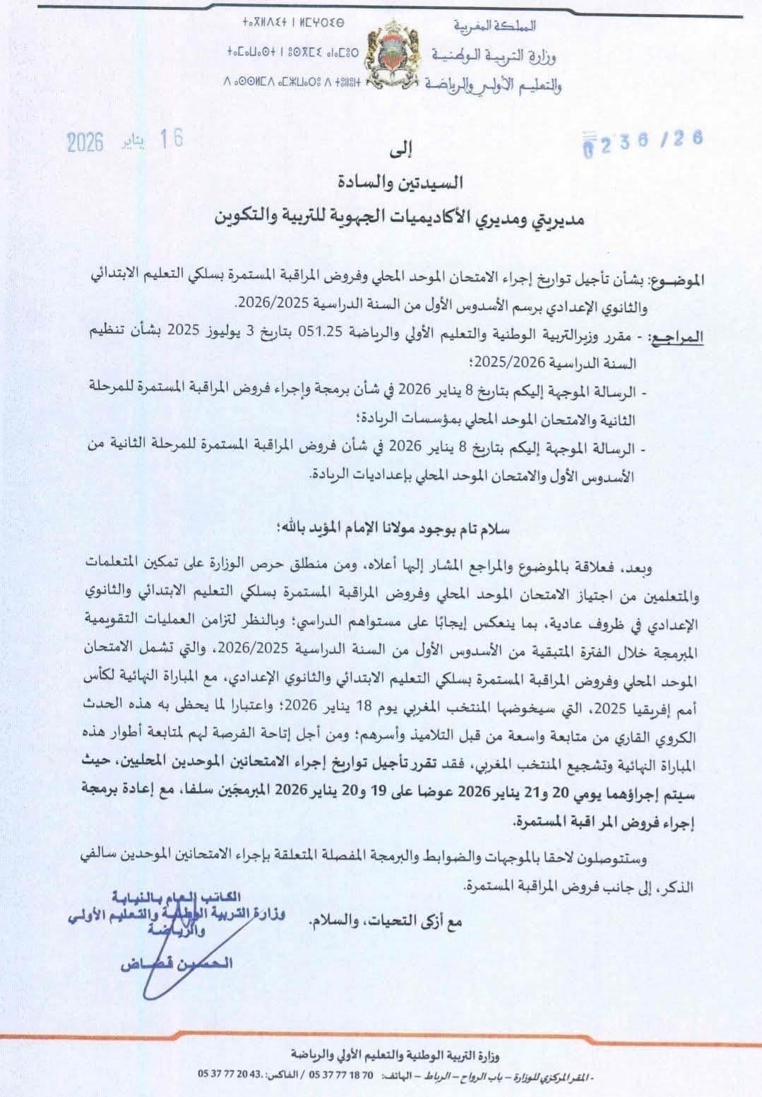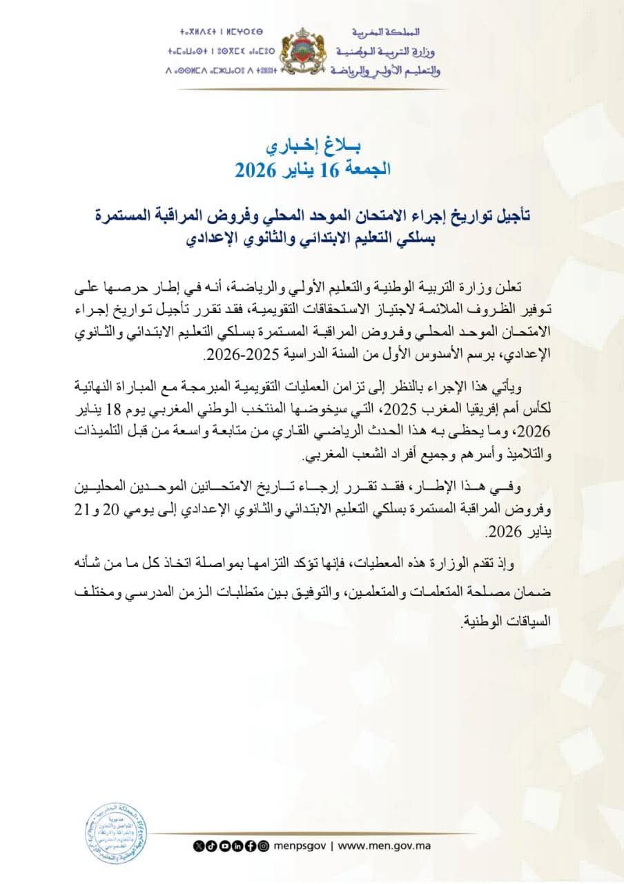 🔴 تأجيل تواريخ إجراء الامتحان الموحد المحلي وفروض